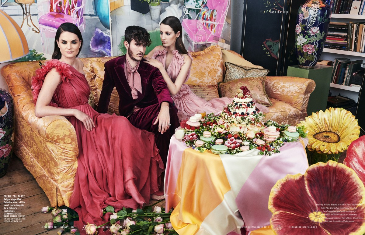 The finale is the sweetest course, a Faerie Tea Party comprising a flower-topped pavlova, rose-flavored macarons, and a trio of exotic sorbets. The models, joined here by Belgian singer Max Colombie, wear clothes that echo the colors of the confections in a room that could double as the world’s most luxurious sweet shop. It may not be the holiday table any of us is used to, but there’s no denying the charm of this one-of-a-kind winter wonderland.