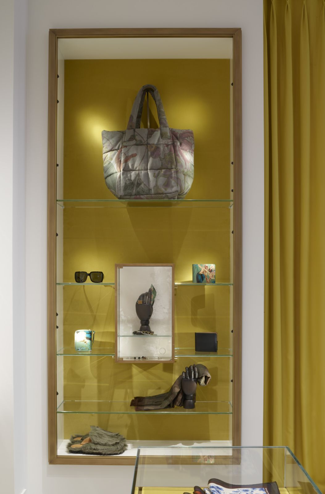 The centrepiece within the store is a 17th century Flemish tapestry depicting a baroque scene of a pergola amidst a garden oasis, a nod to Dries Van Noten’s passion for floriculture. The tapestry has been restored by De Wit Royal Manufacturers, a Belgian specialist in textile conservation, and the design is inspired by the work of Flemish painter and architect Hans Vredeman de Vries, famed for his manipulations of perspectives.