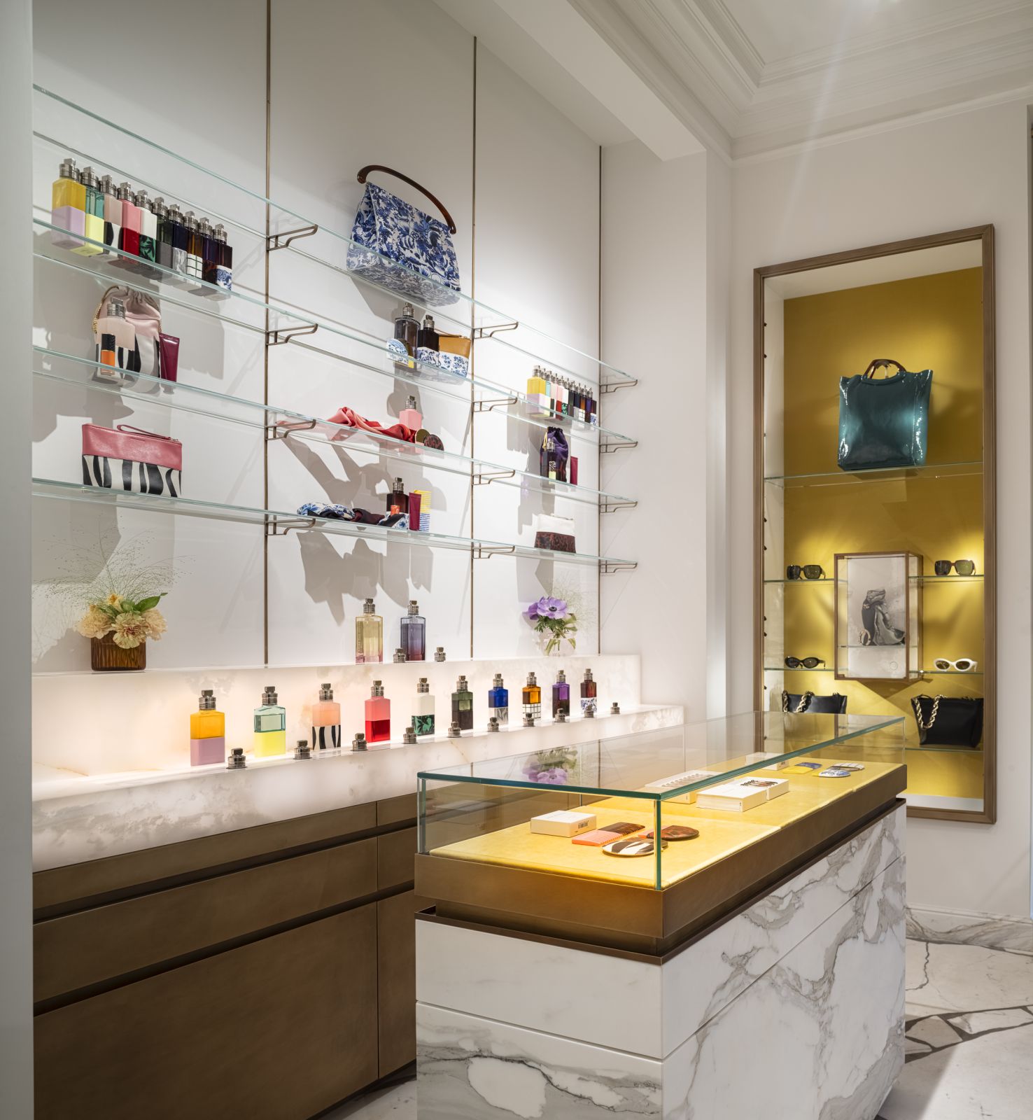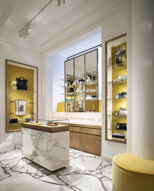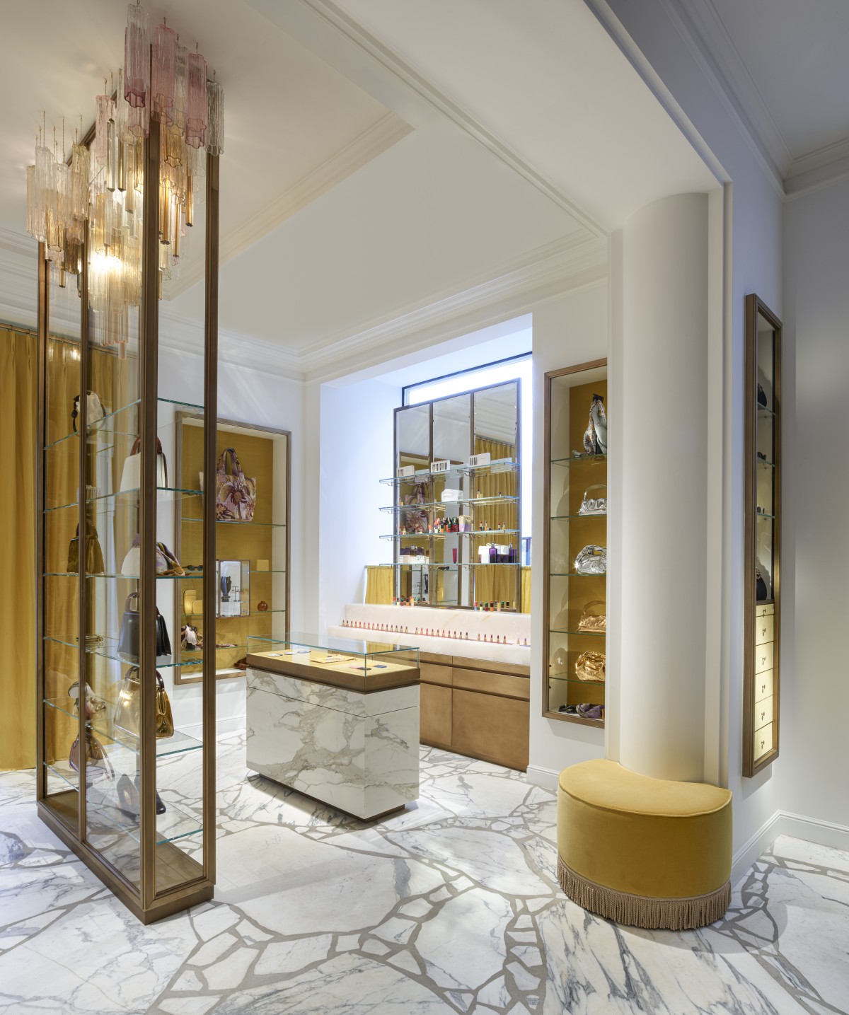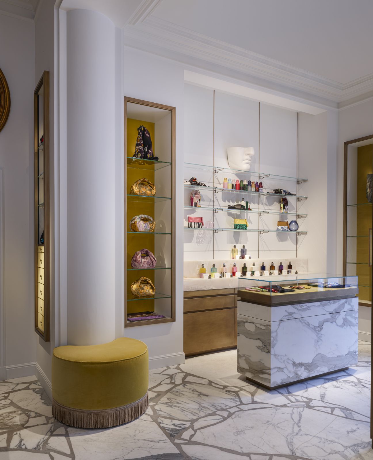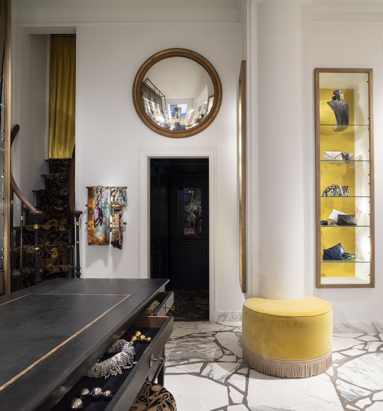A chandelier is composed of different kinds of 1970s Venini glass, which has been reassembled and integrated into the central vitrine. A 19th century bureau from the Swedish Gustavian era sits alongside vivid shades of citrine across textiles and fabrics. A deconstructed marble floor has been crafted using different forms of white marble as an innovative interpretation of traditional French Cabochon flooring.