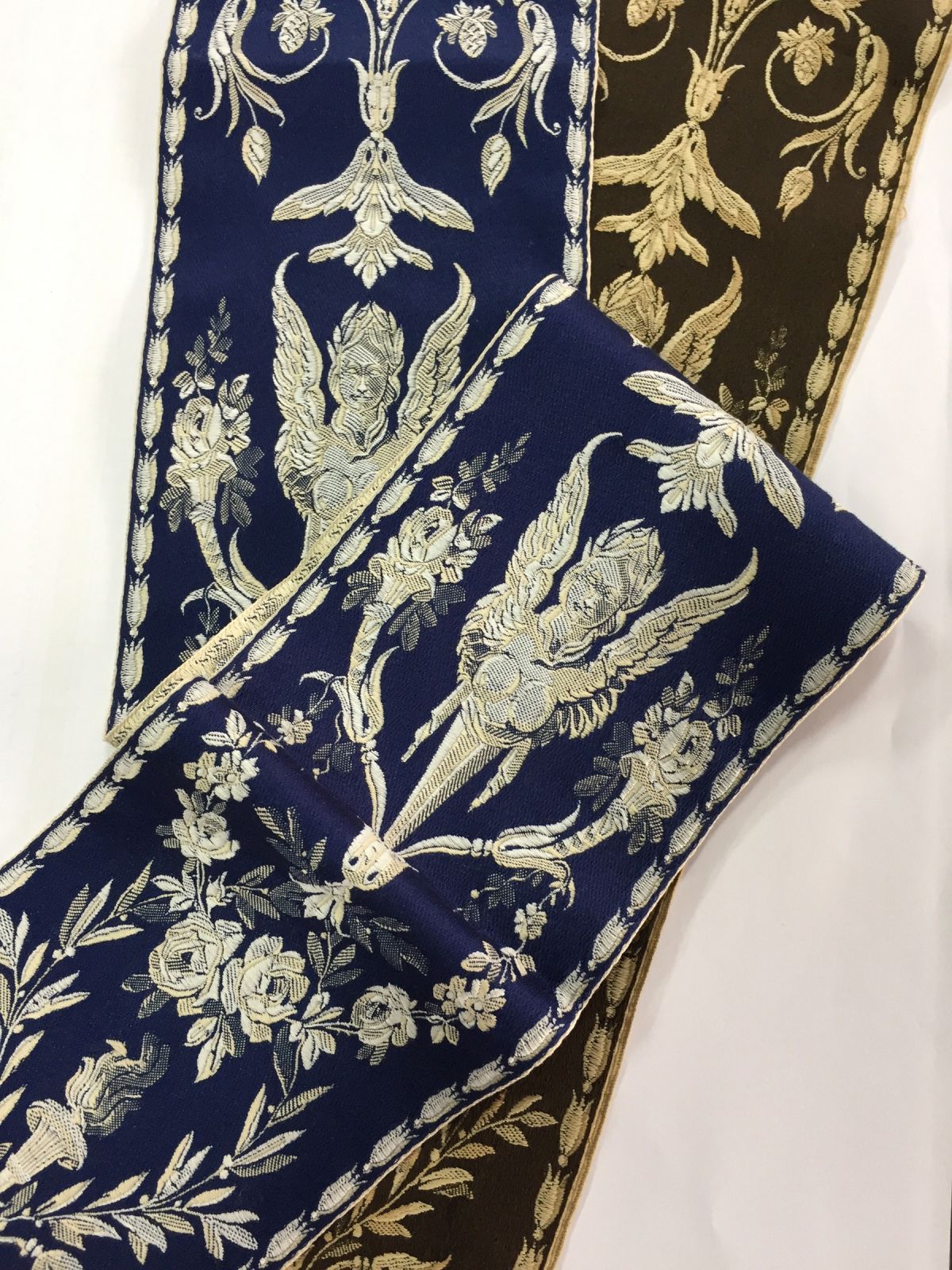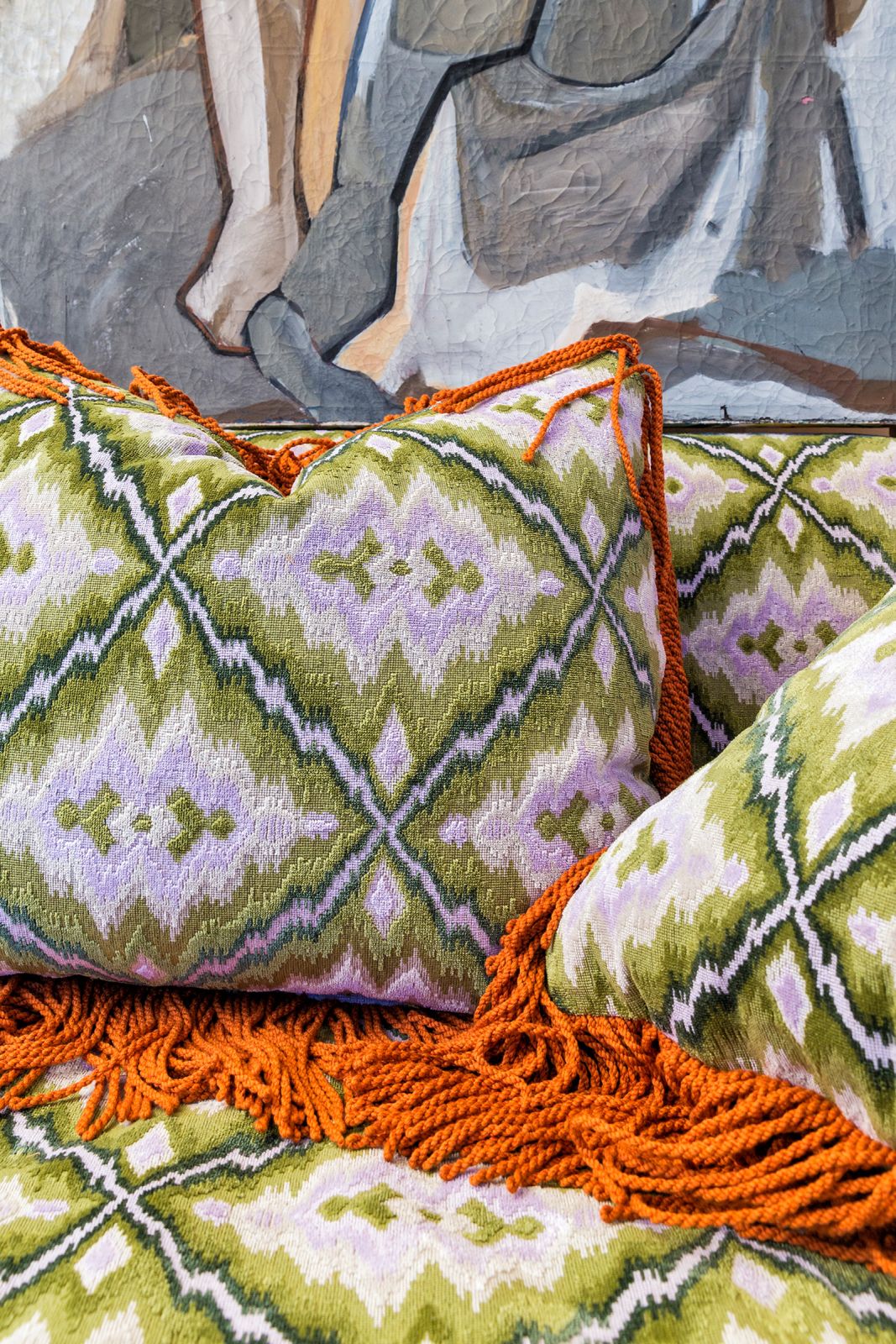 This luxurious linen loop and cut velvet upholstery fabric is rich in both color and texture. Its large-scale motif is inspired by the fantasy world of color and amusement that is presented in Ballet Russes’ production of ‘Petrushka’. Woven by skilled Belgian artisans, this design is a highly coveted piece within the collection.