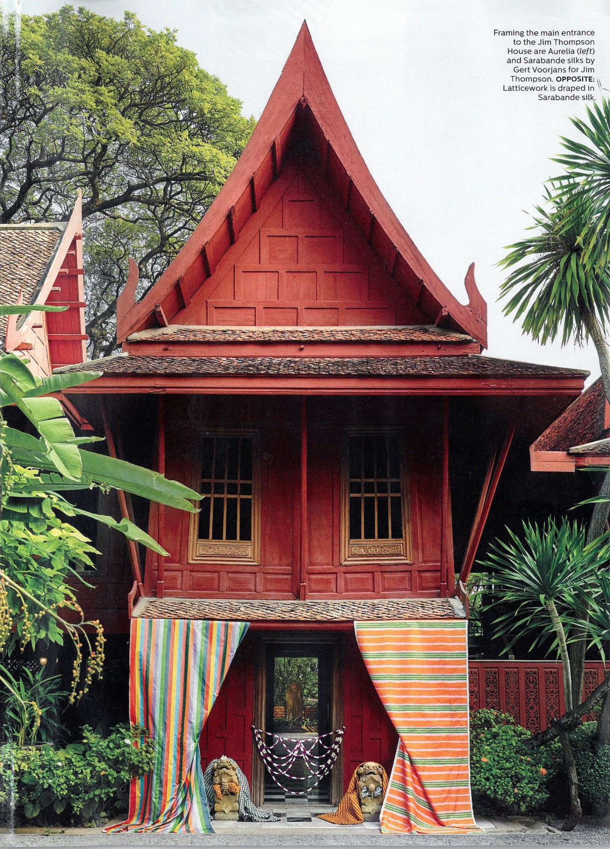Framing the main entrance to the Jim Thompson House are Aurelia (left) and Sarabande silks by Gert Voorjans for Jim Thompson. Photo (c) Richard Powers - as shown in Elle Decor, July-August 2018