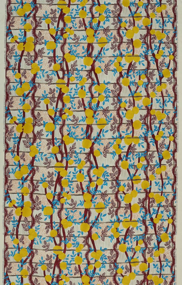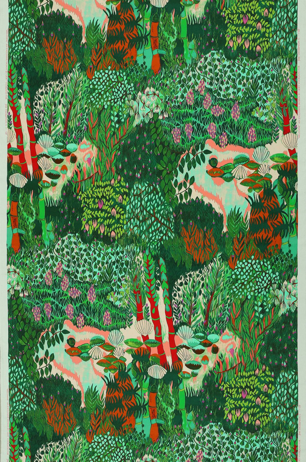 This painterly print features a fanciful garden filled with an abundance of fruit. The brilliant colors and flowing linen ground enhances the lively spirit of this playful design.
