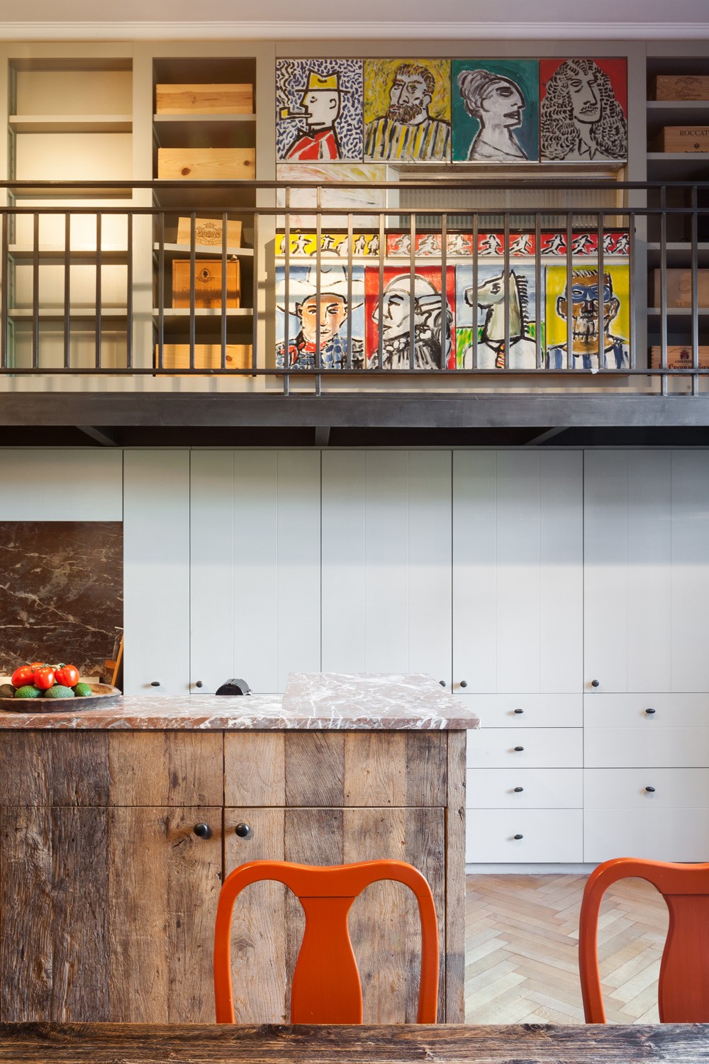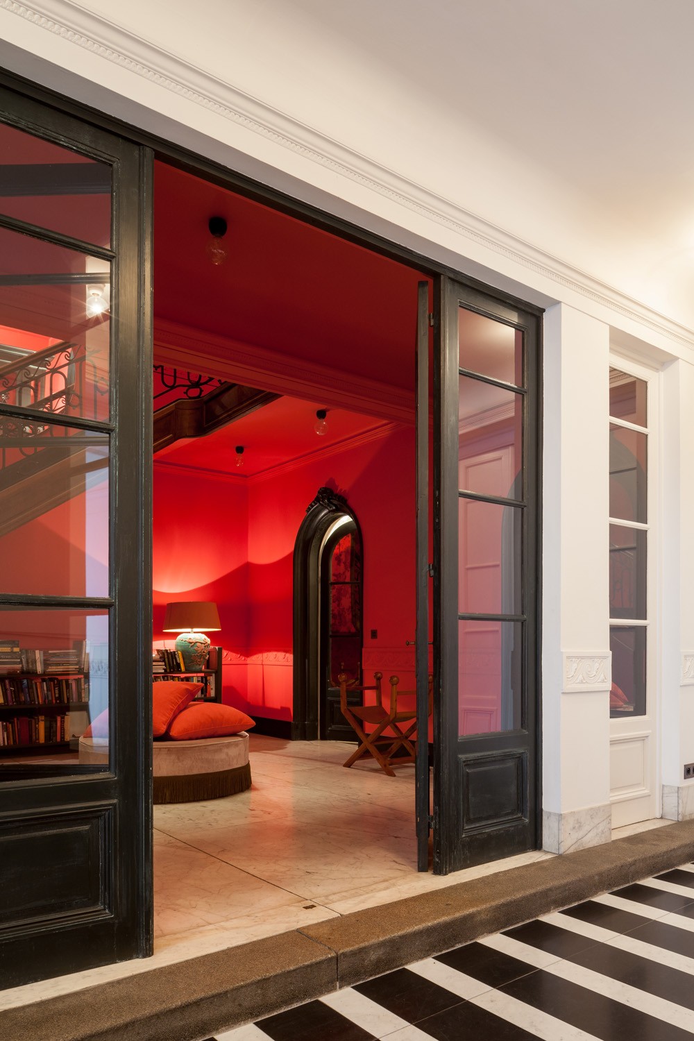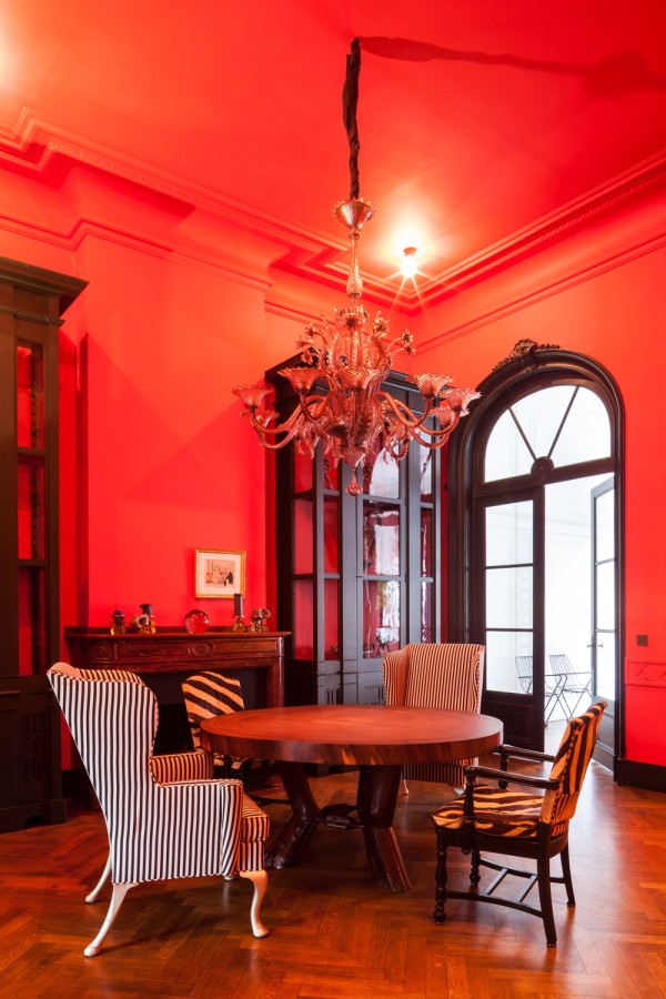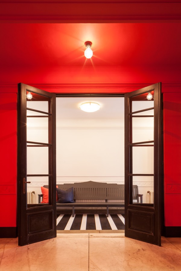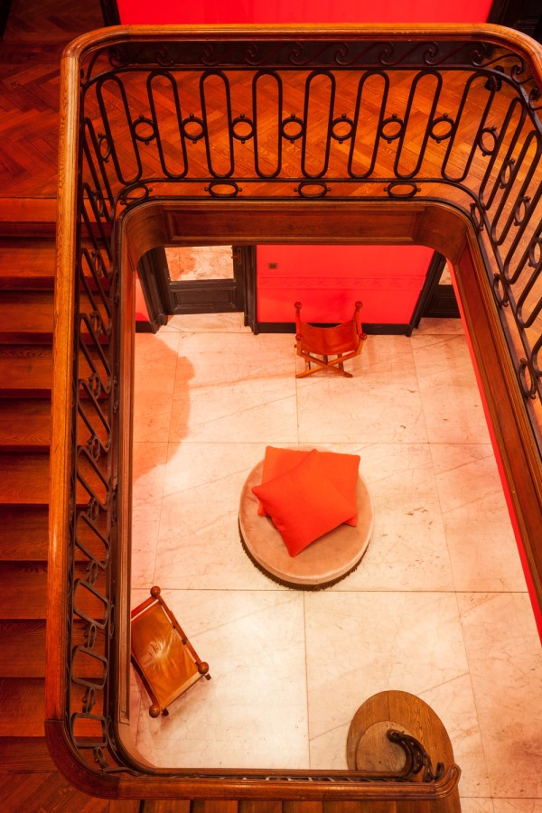 The central staircase in the Antwerp townhouse from 1900 immediately reveals that early bourgeois lifestyle. The escalier d’apparat was an architectural status symbol, intended to make an impression. The entire residence is constructed around the staircase. The various flats and bureaus of the building’s occupants open onto that majestic stairwell. The glass-domed cupola provides daylight access to all storeys along the stairs. Voorjans reinterpreted that skylight here with a contemporary photo installation by Wouter Deruytter.