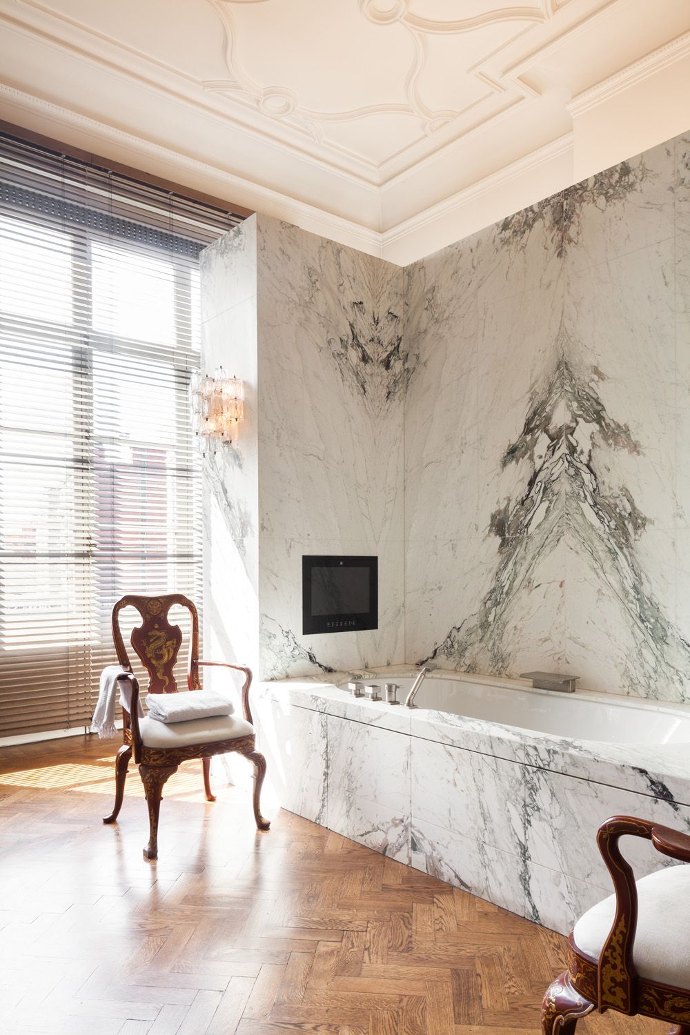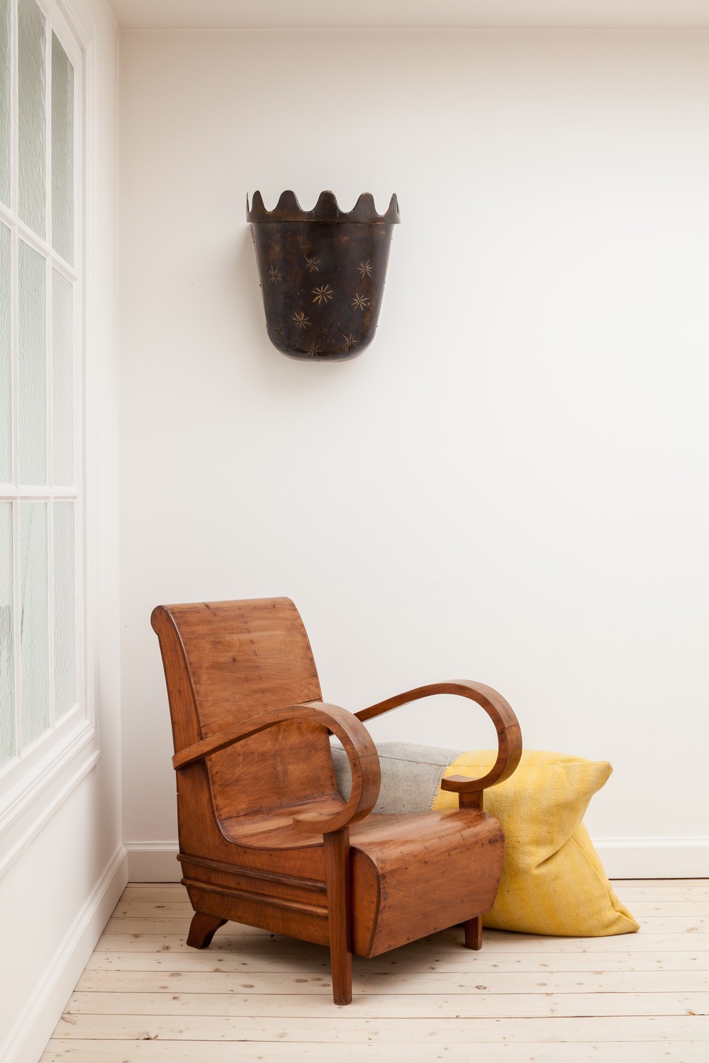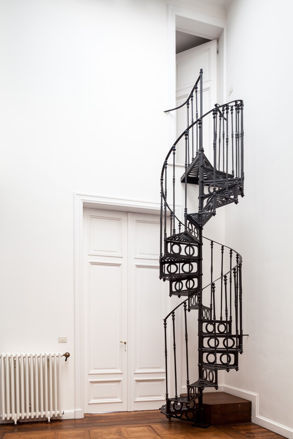 The central staircase in the Antwerp townhouse from 1900 immediately reveals that early bourgeois lifestyle. The escalier d’apparat was an architectural status symbol, intended to make an impression. The entire residence is constructed around the staircase. The various flats and bureaus of the building’s occupants open onto that majestic stairwell. The glass-domed cupola provides daylight access to all storeys along the stairs. Voorjans reinterpreted that skylight here with a contemporary photo installation by Wouter Deruytter.