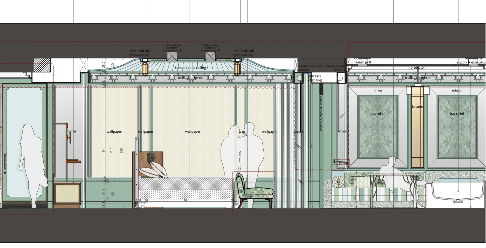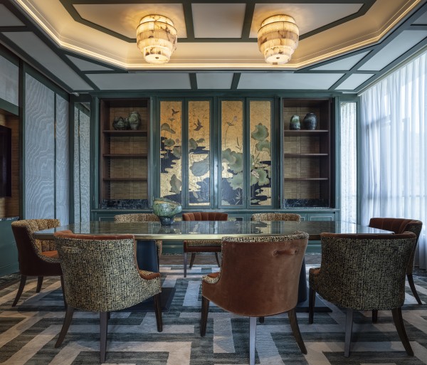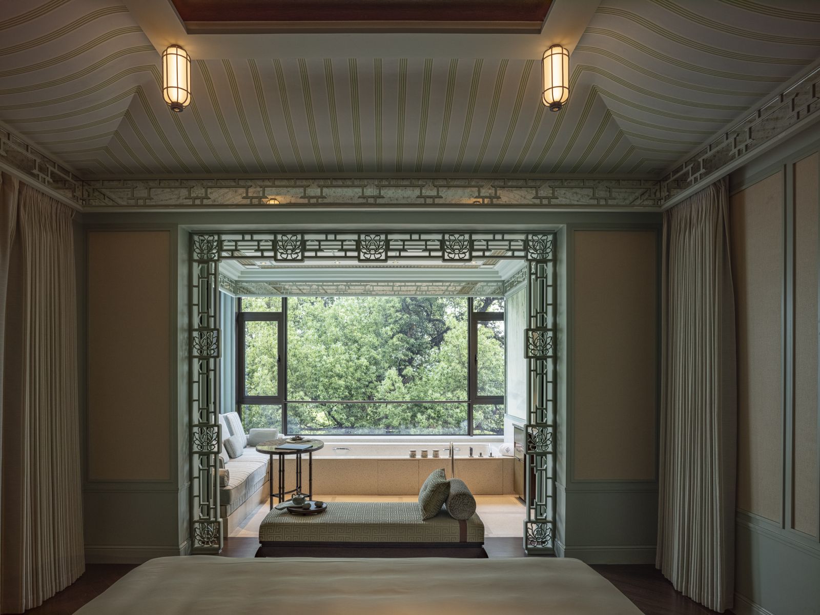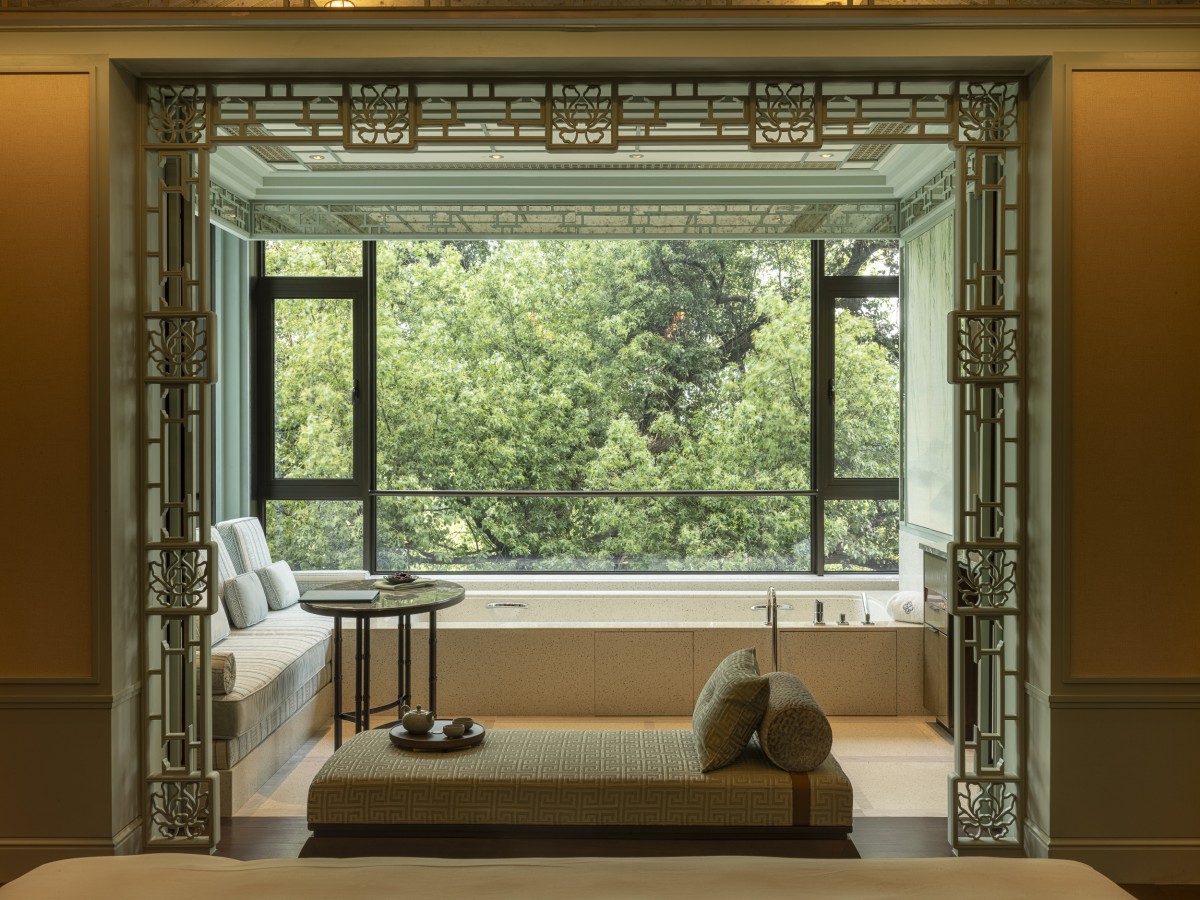 The intimate Romance Room was designed by Studio Gert Voorjans as a proverbial secret garden. The room blends a grand, nature-inspired theme with tactile, soft and cherished charm. Soft botanical motifs in fabrics and rugs celebrate Hanghzou’s fauna and flora. The panoramic view of West Lake enhances the sublime poetic atmosphere. A tented ceiling adds a sense of intimacy, complemented by architectural treillage on the walls, evoking the feeling of a secluded, romantic retreat.