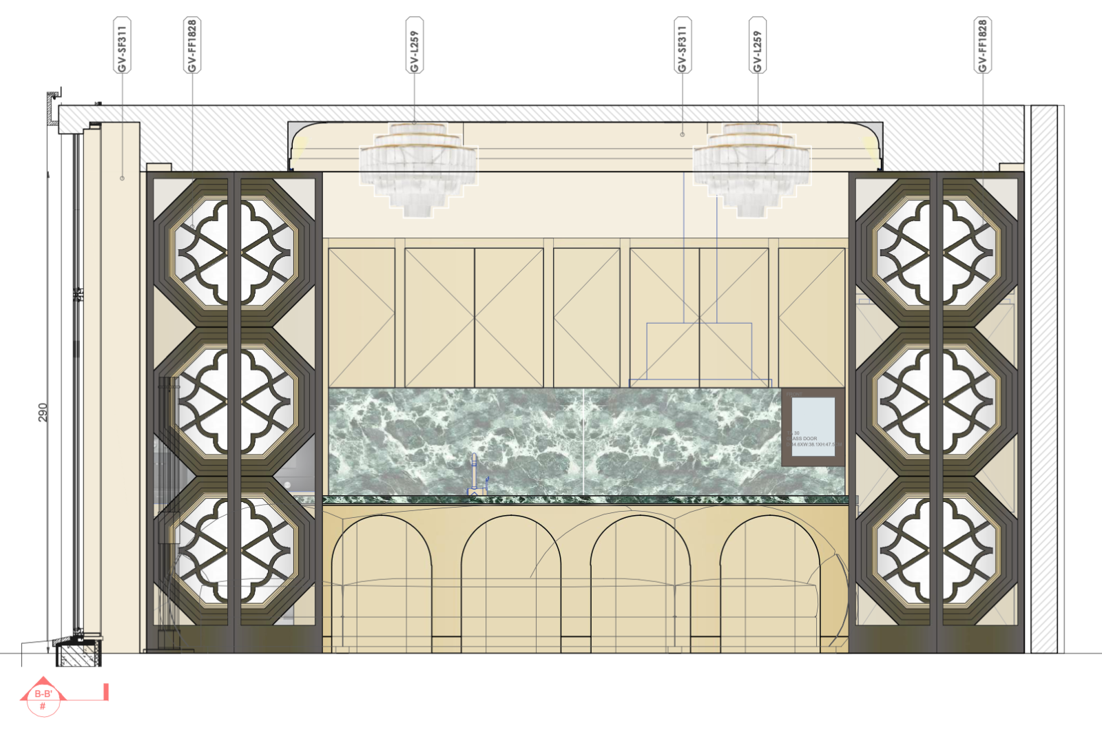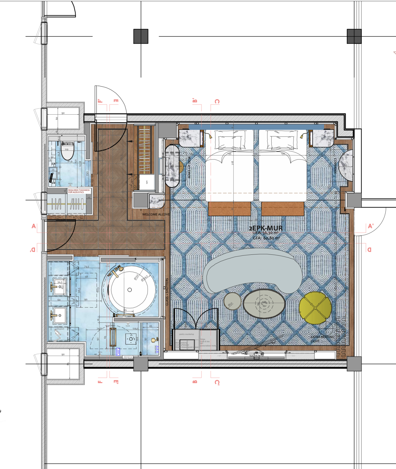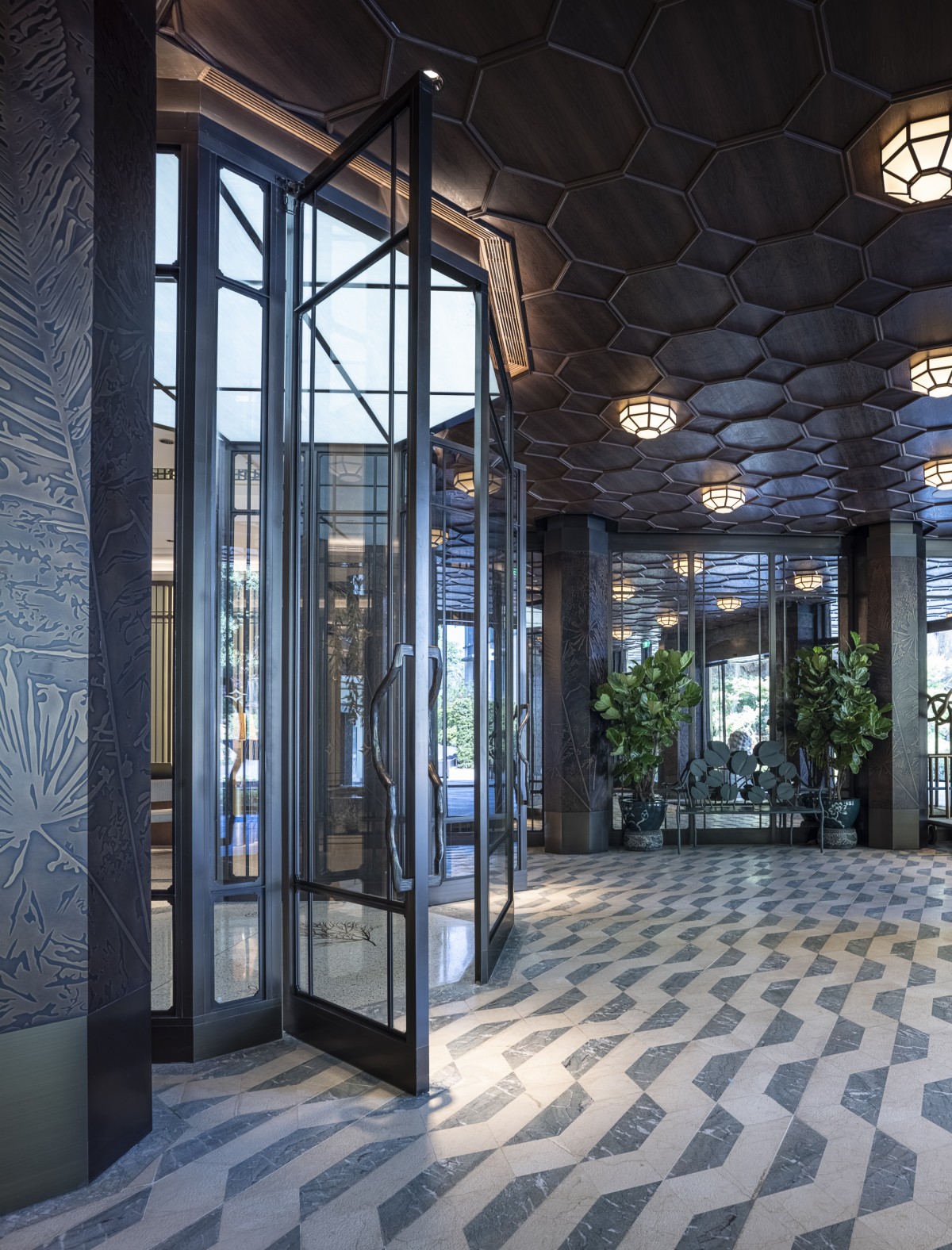 The entrance lobby welcomes guests with a stunning installation, inspired by Hangzhou’s iconic weeping willows over the water’s surface. Crystal branches are suspended above a central pond, adorned with floating brass lotus flowers and leaves. The ‘Crystal Willow’ creates a sense of reflection, echoing the serene beauty of nature in vision and sound. As a tranquil focal point, it invites guests to unwind. Brass leaf inlays, scattered throughout the terrazzo marble floors, evoke the peacefulness of a walk through Hangzhou’s poetic landscape.
