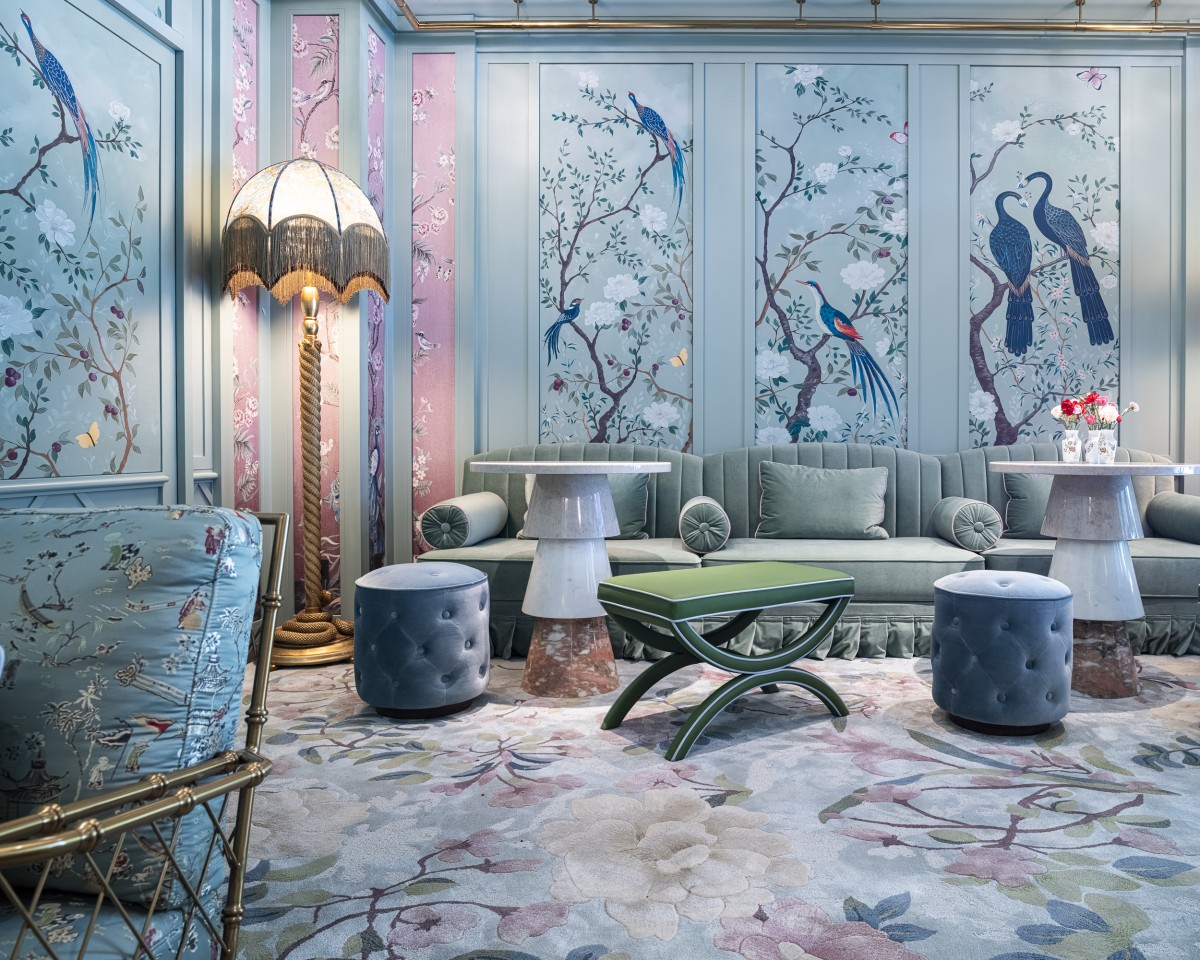 Each floor follows a distinct thematic concept, reflected in both artwork and color accents. The second floor’s design was built around an earthy theme, inspired by the lush garden views from the lobby. This floor emphasizes greenery, with an earthy honey and sand-gold palette for the carpet and ceiling. One floor higher, the corridor was designed around a floral theme, with an abundance of floral motifs, soothed by a fresh and peaceful celadon color scheme. On the fourth floor, the fauna team prevails. The design of this corridor is dedicated to the region’s rich birdlife, with intricate detailing of avian forms, highlighted against a serene sky-blue backdrop. Each passageway feels immersive, enhancing the overall guest experience with a deep connection to Hangzhou’s landscape.