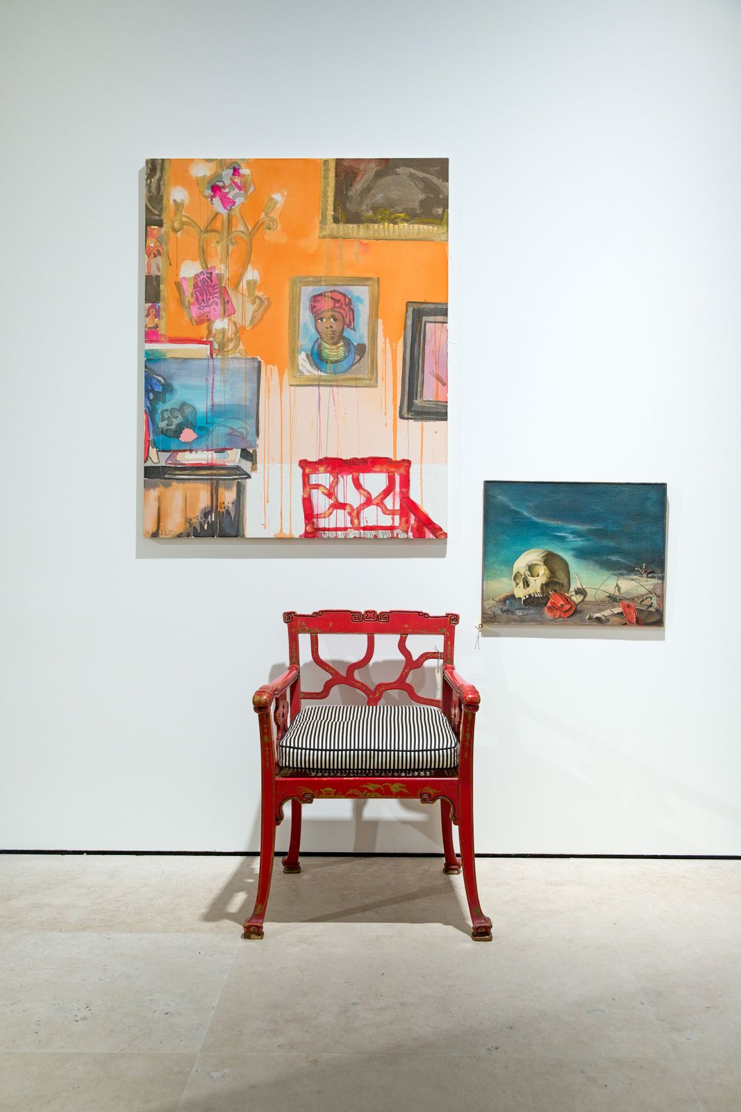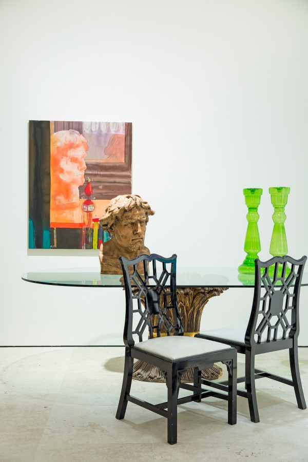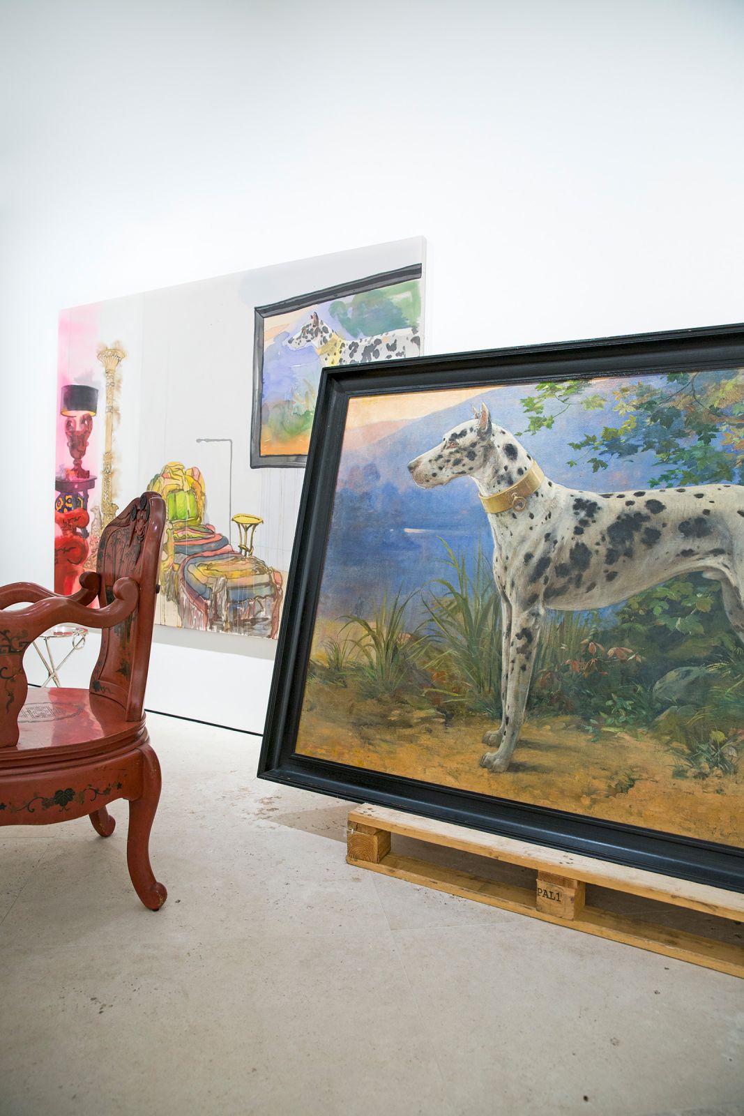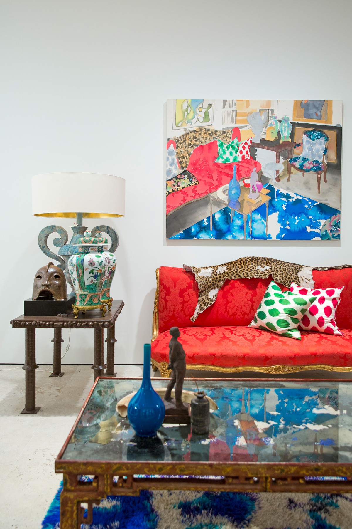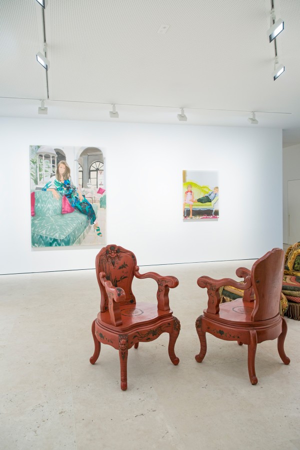 Maruani Mercier brought both artists together and gave them free reign over the gallery. With a curated look, Voorjans transformed four rooms, making them seem as if inhabited by a dedicated collector for the past decade. With her wet-on-wet technique, Markus' playfully transferred these spaces on canvas in bright and translucent colours. On commission, she also portrayed several of Voorjans' friends, lounging in their rooms.