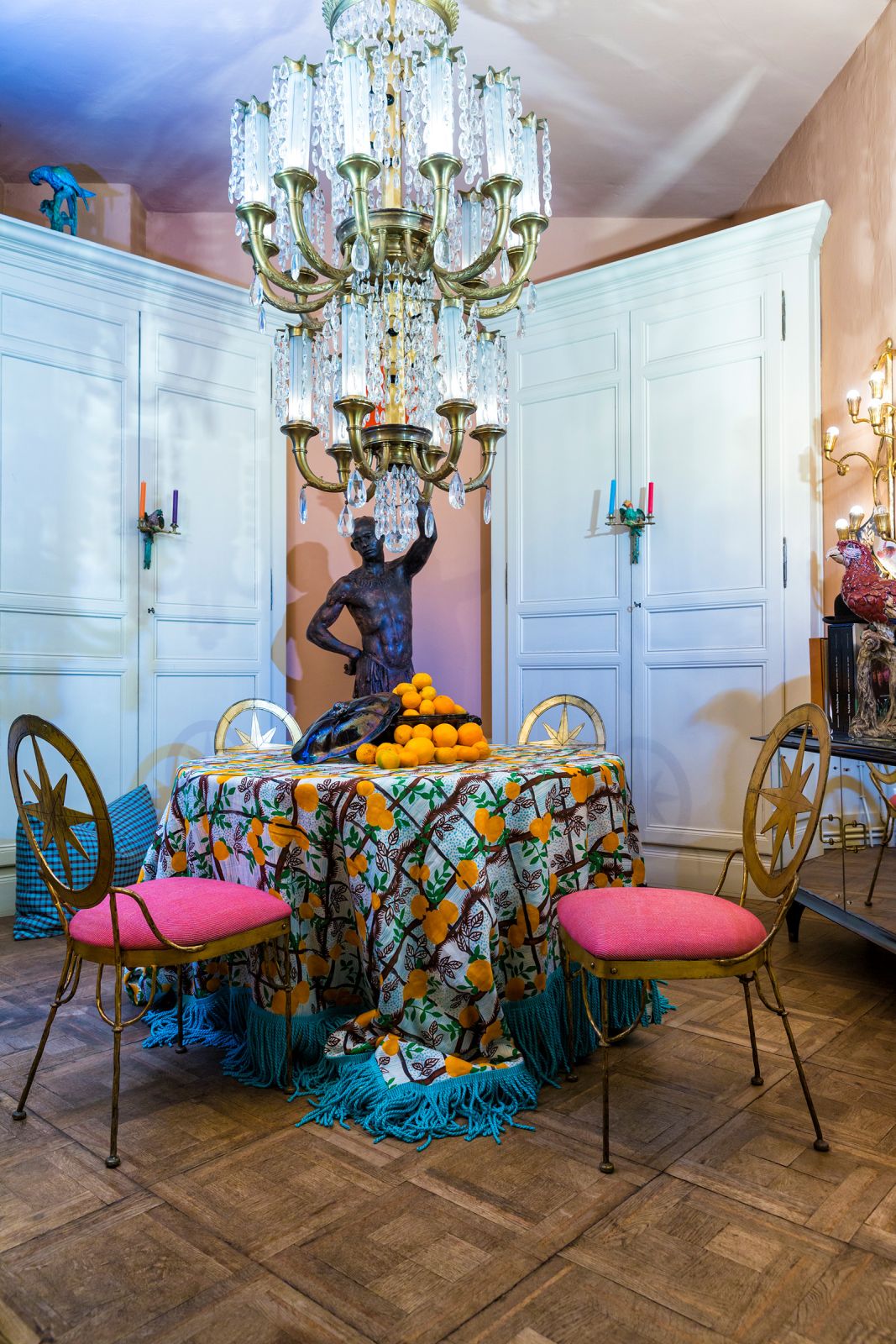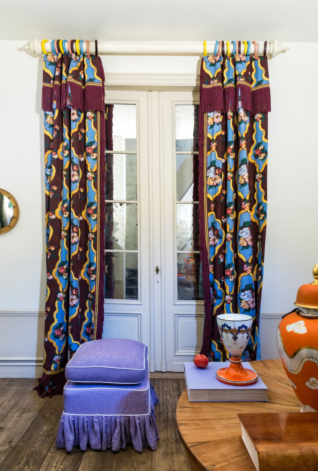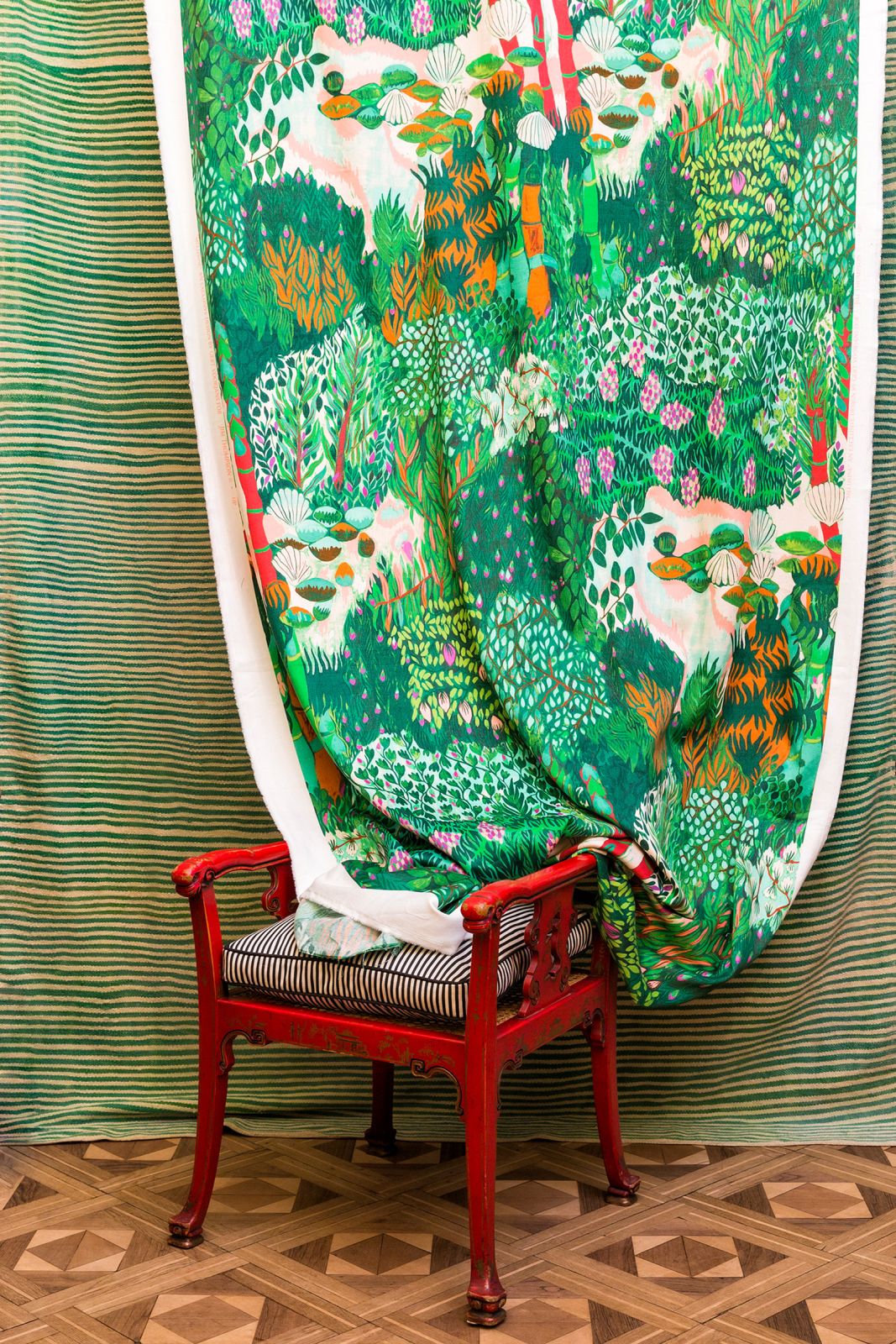 Inspired by an antique European tapestry displayed in Gert’s chic Antwerp home, Anastasia is a modern rendering of a three-meter decorative curtain panel that is printed in a contemporary palette, for flowing draperies or statement wall upholstery.