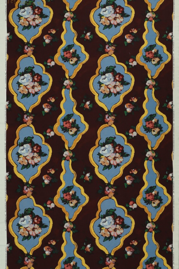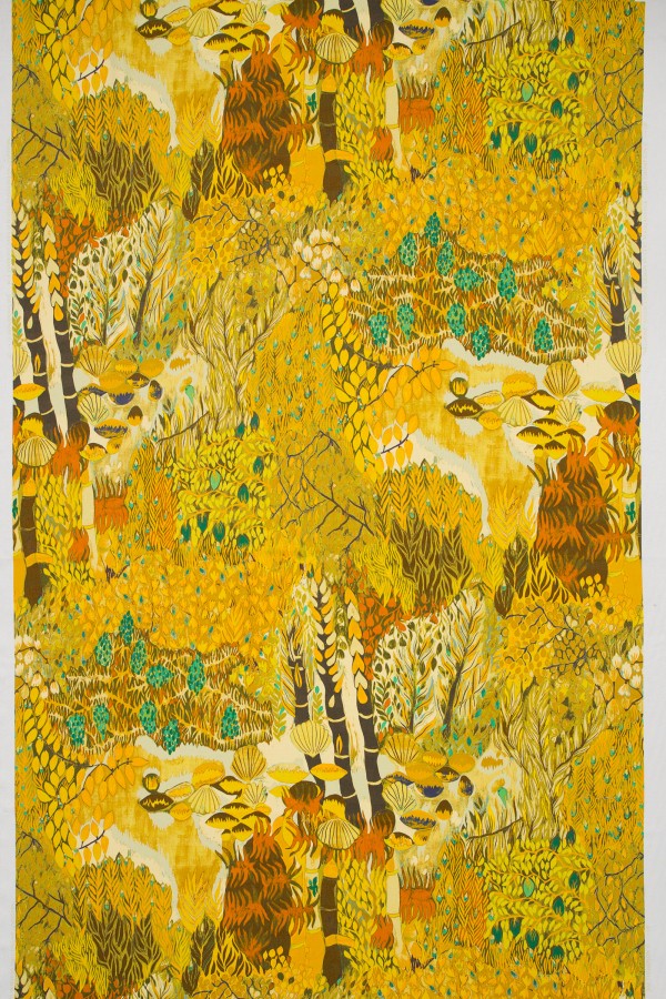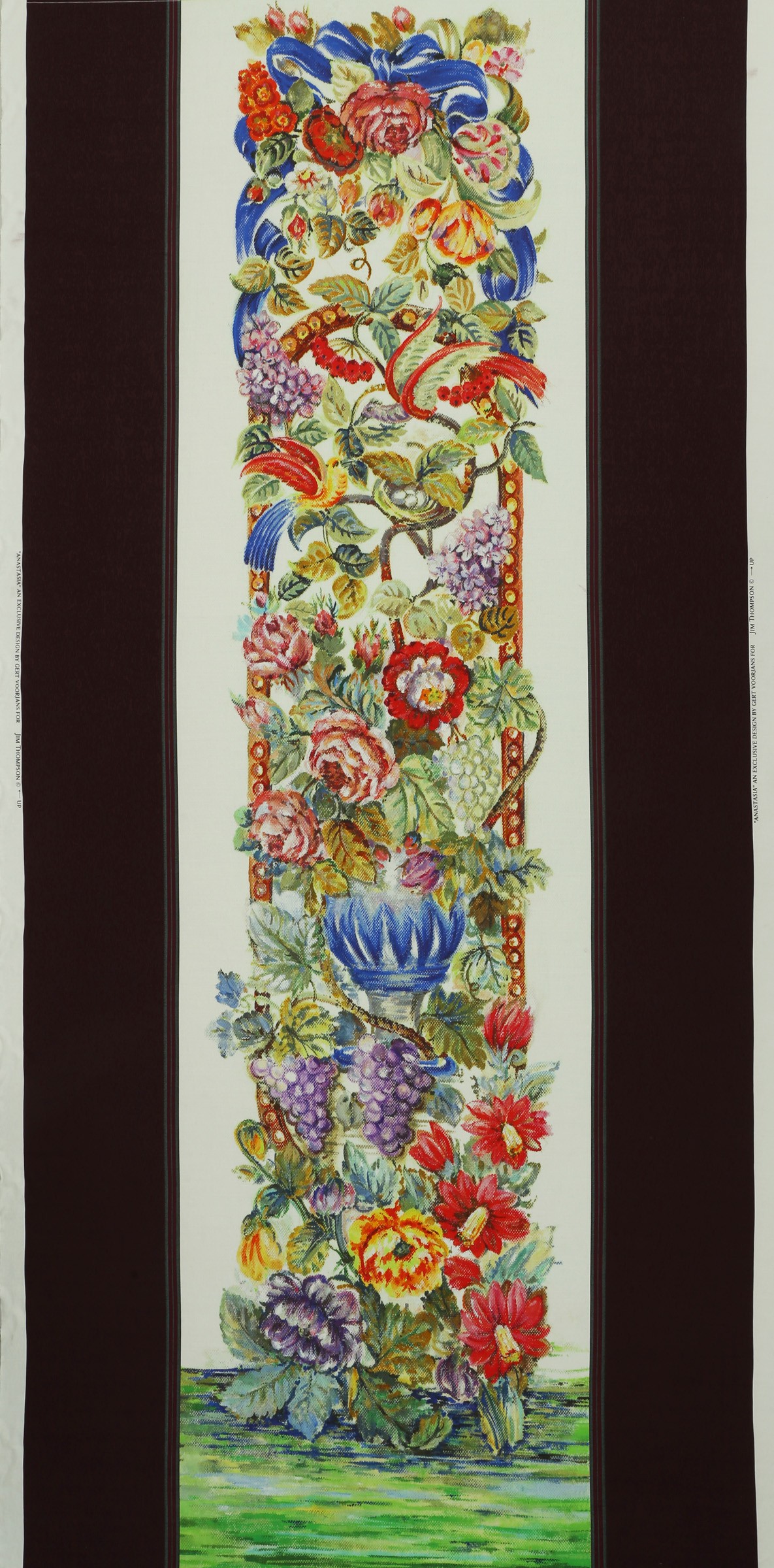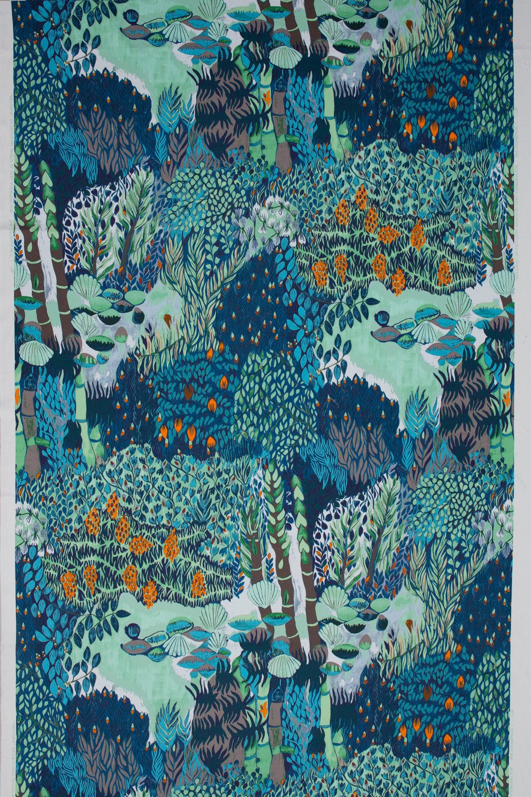 This painterly print features a fanciful garden filled with an abundance of fruit. The brilliant colors and flowing linen ground enhances the lively spirit of this playful design.